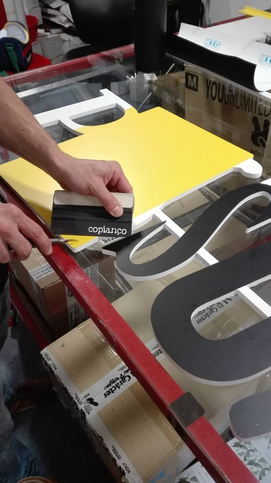 - Aplicação de logotipo em PVC de 10mm recortado em fresa com vinil de recorte aplicado, iluminado a luz LED